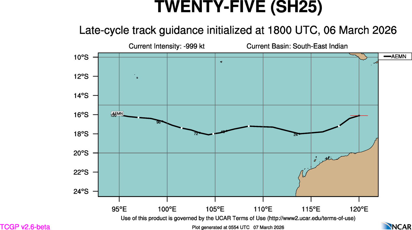 At 1800 UTC, 06 March 2026, TWENTY-FIVE (SH25) was located in the South-East Indian basin at 16.1°S and 120°E. The current intensity was -999 kt and the center was moving at -999 kt at a bearing of -999 degrees. The minimum central pressure was -999 mb.