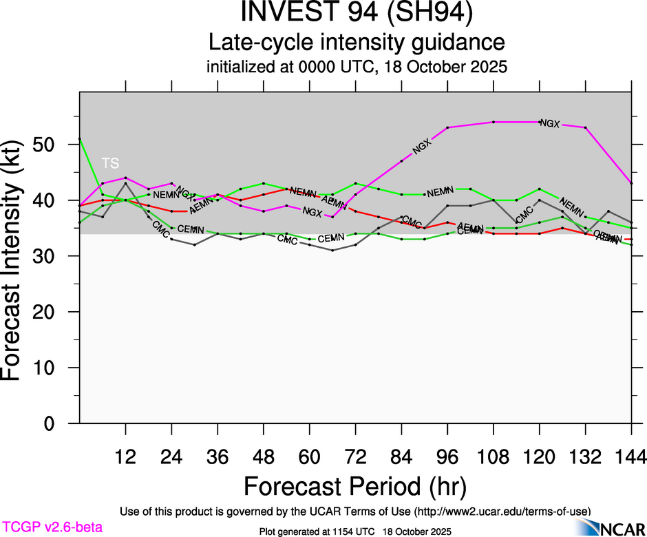 This page provides plots and information for INVEST 94 (SH94). The left side of this page provides TCGP-generated plots of numerical guidance and other TCGP-curated data. The right side of this page provides external links to additional information and products. Most of the model guidance displayed in the plots come from modeling centers outside of NCAR, such as NOAA, other national numerical weather prediction centers, and universities. Click here for information about who contributes to TCGP. Your use of this page is governed by the UCAR Terms of Service and this site's disclaimer. To obtain help for any item on this page, click on the question mark beside that item.