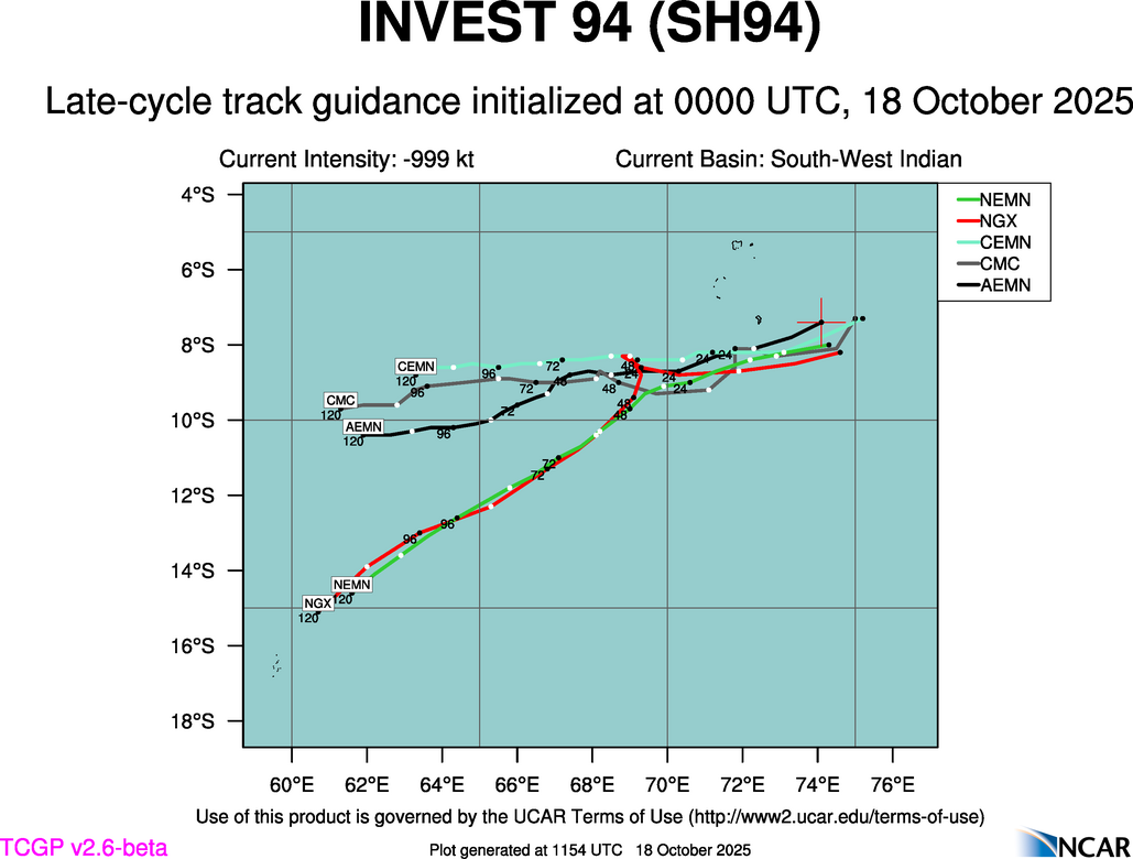 At 0000 UTC, 18 October 2025, INVEST 94 (SH94) was located in the South-West Indian basin at 7.7°S and 75.7°E. The current intensity was -999 kt and the center was moving at -999 kt at a bearing of -999 degrees. The minimum central pressure was -999 mb.